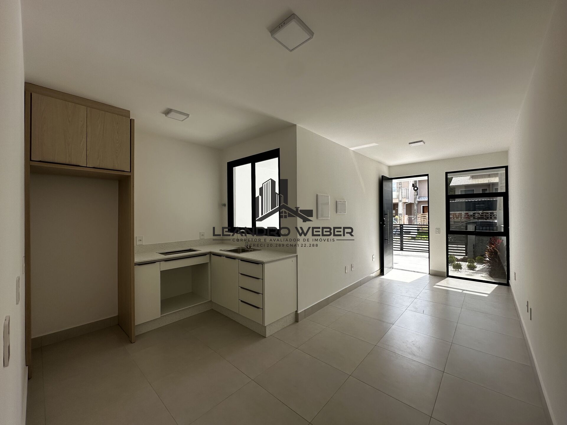 O imóvel possui um acabamento refinado, com massa corrida, iluminação em LED em todos os ambientes, piso em porcelanato interno e externo, além de fachada moderna com detalhes em vidro que valorizam ainda mais o projeto. A cozinha já vem planejada, com móveis e cuba em inox, e o banheiro é entregue mobiliado, com box e nicho — pronto para uso.